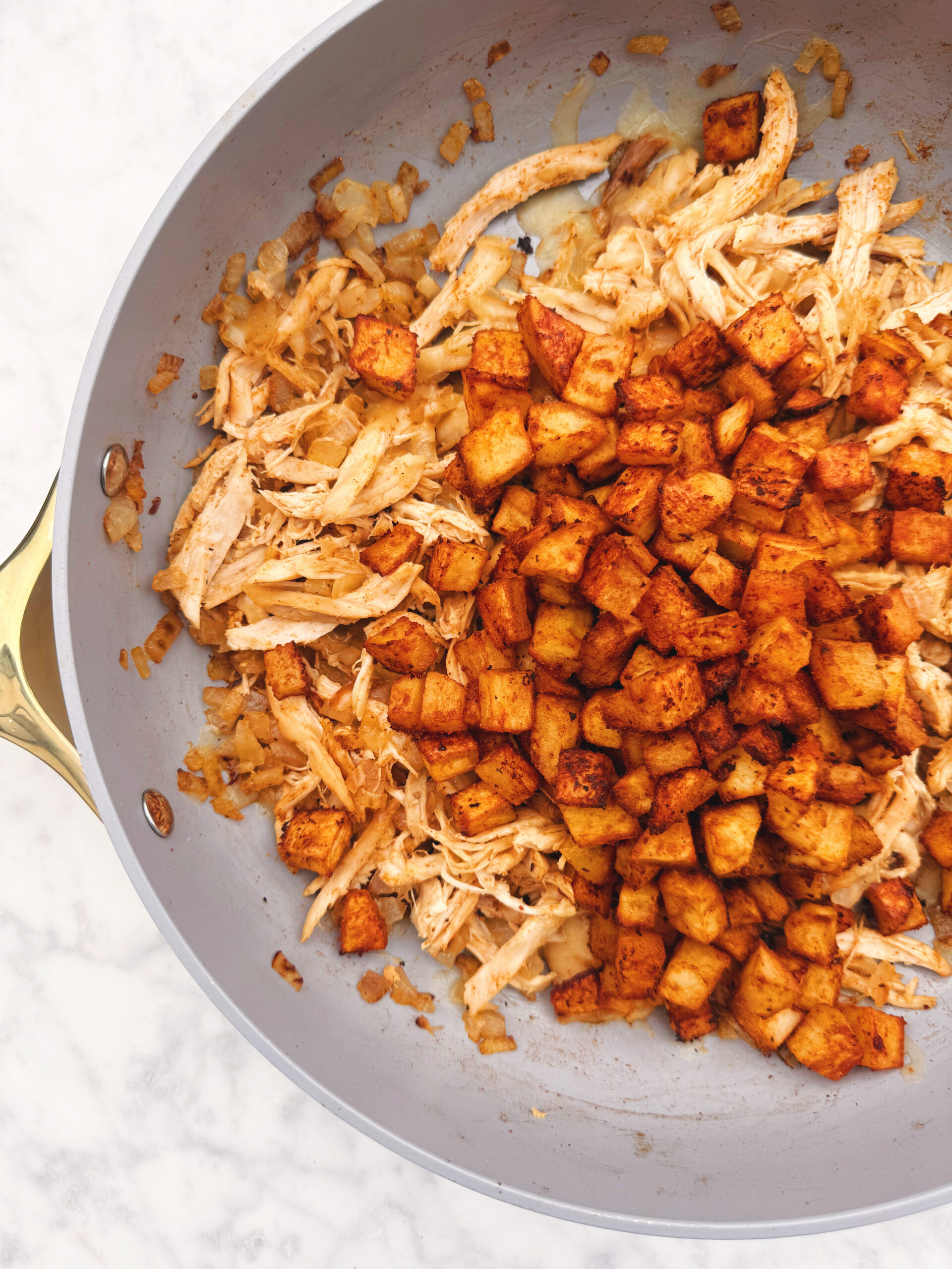 Let the potatoes sit for 5 minutes before adding them to the chicken filling. This keeps them from falling apart when you roll the enchiladas.