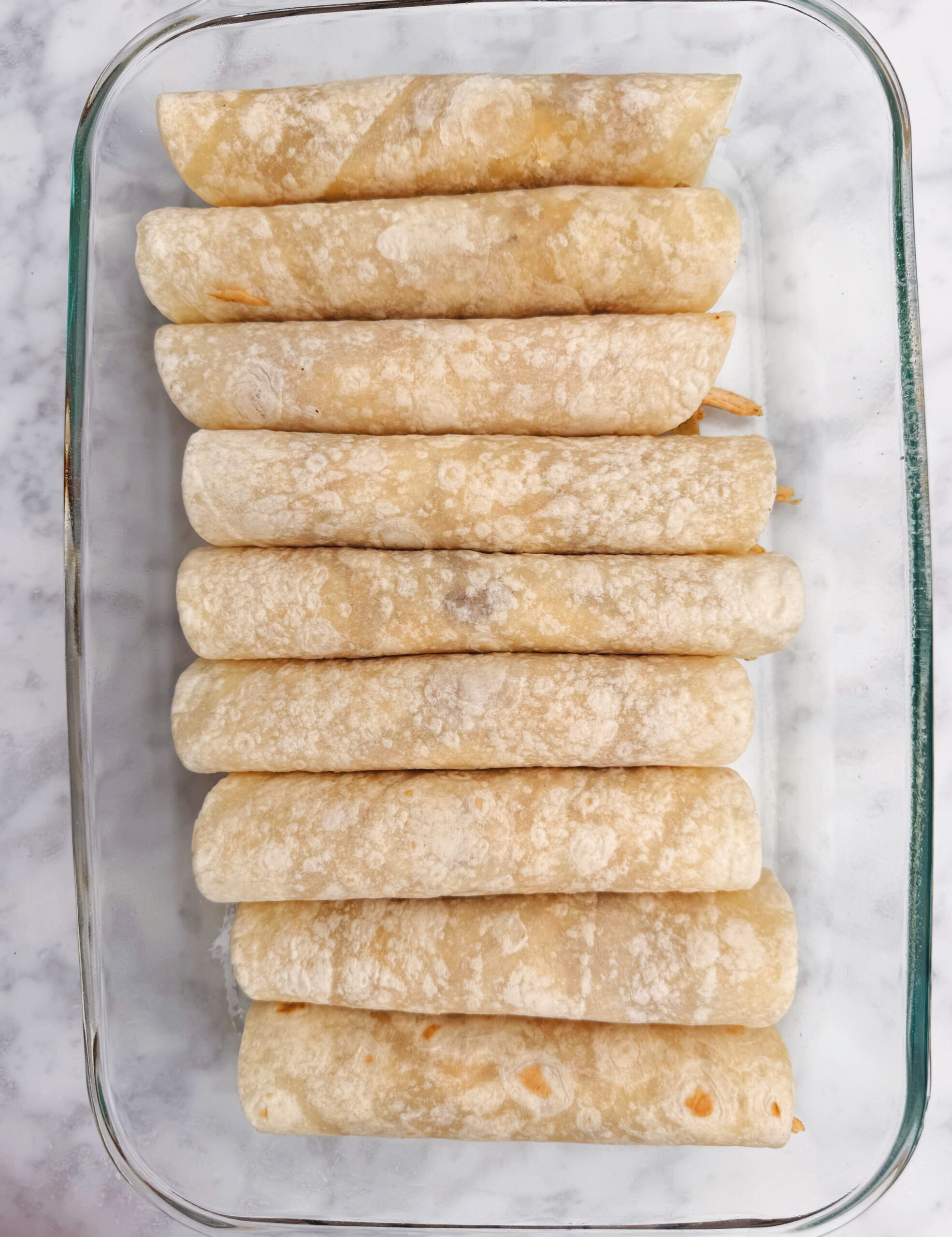 Warm your tortillas for about 30 seconds in the microwave (this will keep the tortillas from breaking apart). Spoon filling down the center of each tortilla, roll up, and place seam side down in a dish.