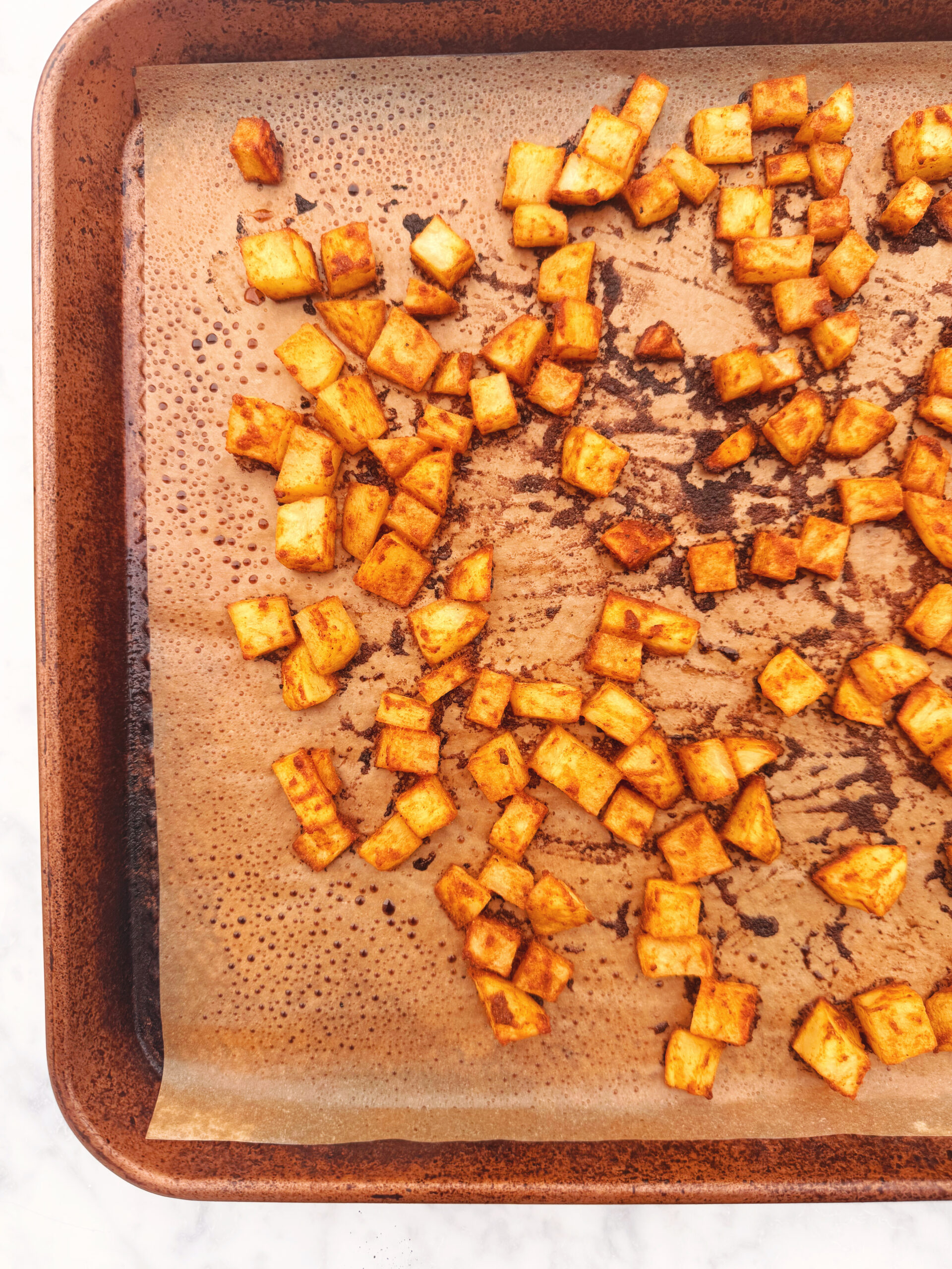 Toss the potato cubes with olive oil, then sprinkle with all the spices, salt, and pepper. Mix until every cube is well coated.