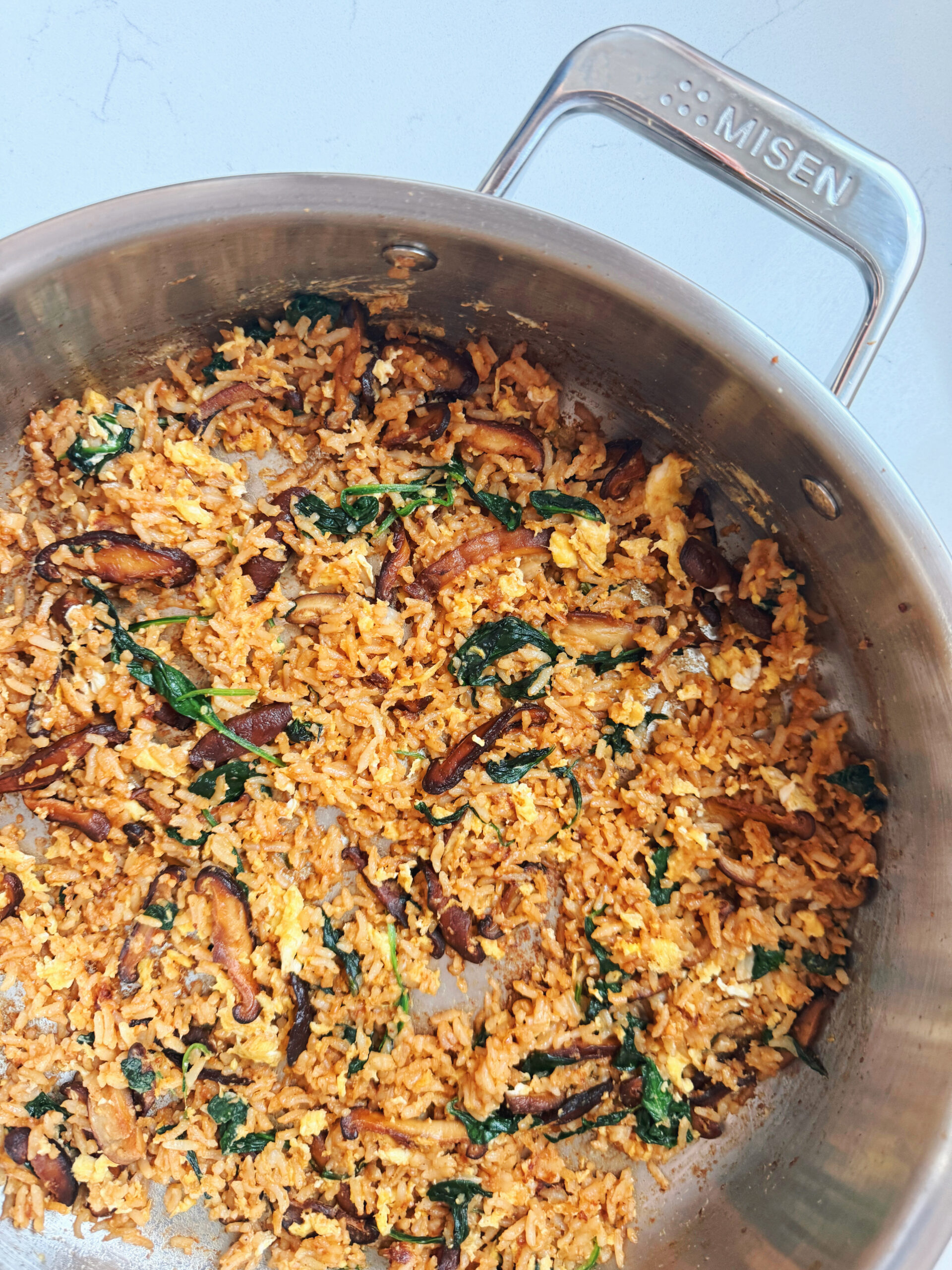 This quick, flavorful fried rice features browned shiitake mushrooms and vibrant spinach, all brought together with crispy day-old rice and perfectly scrambled eggs.
