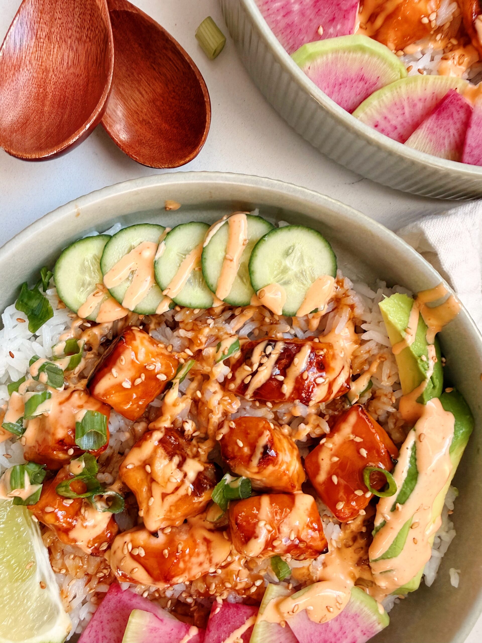 Divide the 4 cups of cooked rice between four bowls. Arrange the salmon cubes over the rice, then tuck in your cucumber slices and avocado slices around the bowl. Scatter the green onions generously over everything. Drizzle the reserved teriyaki sauce over the salmon, then drizzle a generous amount of Sriracha mayo on top. Finish with a pinch of sesame seeds.