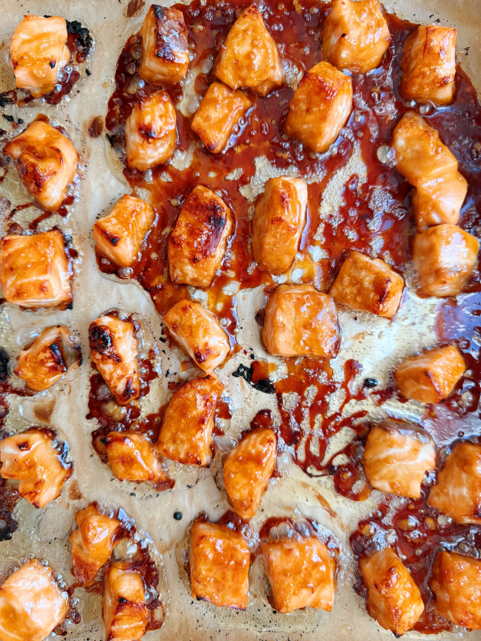 Preheat your oven to 425°F. Line a sheet pan with foil or parchment and oil it. Spread the salmon cubes in a single layer and bake for 10–12 minutes until the glaze is set and the salmon flakes easily. For more caramelization, switch to broil for the last 2 minutes.