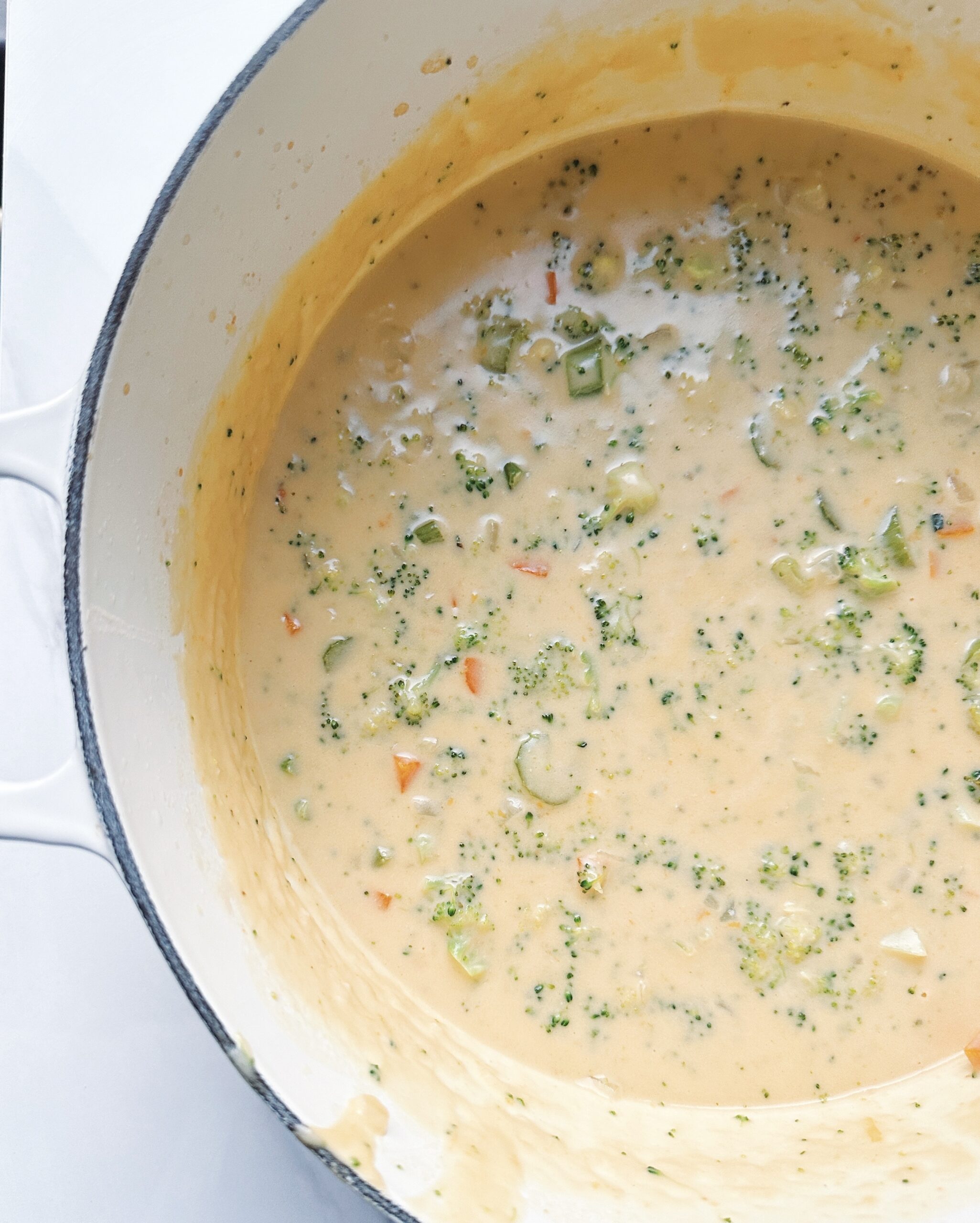 Add in the cooked veggies along with the chopped broccoli. Allow to simmer for an additional 10 minutes. Stir in the shredded cheddar cheese and cook until the cheese is melted.